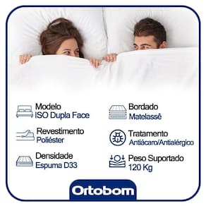 O Colchão Ortobom Colchão Iso Duplo Conforto é a da Ortobom entre os colchões mistos. De um lado possui o seu lado macio com suporte e camada de conforto em espuma D28 Pró Aditivada de Alta Performance, Ideal para pessoas com até 80 quilos. Do outro lado possui o seu lado firme com suporte e camada de conforto em espuma D33 Pró Aditivada de Alta Performance, Ideal para pessoas com até 100 quilos. O tampo é bordado em Matelassê, que uma camada extra de conforto. Seu revestimento é em Poliéster com tratamento e .