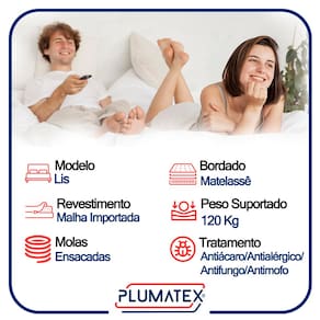 Cama Box Casal Suede + Colchão Lis Molas Ensacadas Plumatex 138x188x64cm É revestido em Bambú Fresh em Malha de Poliéster com Viscose que oferece um toque muito mais refrescante e confortável, sua lateral é em Camurça. Tem sua estrutura em molas ensacadas individualmente, que reduzem a vibração ao longo de sua superfície, garantindo mais conforto e perfeita acomodação, além de permitir que uma pessoa se movimente sem incomodar quem está ao lado. Possui Ortopillow com camada extra de conforto e bordado em matelassê, que maximiza a sensação de maciez. Conta com respiros laterais que permite uma maior ventilação no Colchão, evitando a proliferação de ácaros, bactérias e fungos, recebe tratamento antialérgico e antiácaro, preocupação extra com sua saúde. Devido a tecnologia No Turn, não precisa ser virado. Características do Colchão: - Marca: Plumatex - Modelo: Lis - Tamanho: Casal - Estrutura Interna: Molas Ensacadas, manta de espuma D26 de Alta Performance, Ortopillow. - Estrutura externa: Tecido em Bambú Fresh em Malha de Poliéster com Viscose de alta resistência e maciez, lateral em Camurça, bordado em Matelassê, manta de espuma D26 Pró Aditivada.. - Nível de Conforto: Firme - Altura: 25cm - Largura x Profundidade: 138x188cm - Peso: 37kg - Acompanha: 1 Colchão Plumatex + Manual - Este produto possui 1 volume - Proteção: Antialérgico, Antiácaro, Antifungo, Antimofo - Peso Suportado por Pessoa: 120kg - Dimensões do Produto: Largura: 138cm Altura: 24cm Profundidade: 188cm Características do Box: - Marca: Home Queen - Estrutura Interna: Estrutura em madeira 100% de Reflorestamento - Estrutura Externa: Suede - Tratamento Antiácaro: Sim - Tratamento Antialérgico: Sim - Saída de Ventilação: Não - Ortopédico: Não - Tecido Antiderrapante: Não - Suporta até (kg): 150 Kg - Necessita Montagem: Não - Dimensões do box (largura x comprimento x altura): 138x188x40cm Dimensões do Produto: - Altura (Box + Colchão): 65cm - Largura: 138cm - Comprimento: 188cm - Altura dos Pés: 12cm *As cores do produto podem variar de acordo com o monitor, a iluminação do ambiente e a sua percepção visual.* *Confira as dimensões do produto e certifique-se de que passará normalmente por supostos elevadores, portas, escadas e/ou corredores de sua residência.* *Verifique nossas politicas internas para que não haja nenhuma dúvida no processo de entrega ao finalizar a compra, pois não fazemos a montagem e desmontagem do produto e/ou portas e janelas, transporte pela escada ou içamento pelo lado de fora do prédio.*