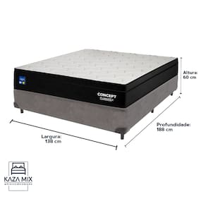 Bem-vindo(a) ao nosso catálogo!Apresentamos a você uma descrição completa sobre esse produto:Fundada em outubro de 1984, a Plumatex se destaca como a mais moderna e bem estruturada empresa do segmento colchoeiro, com cinco fábricas próprias instaladas nos estados de Goiás, Bahia, Paraíba, Rio de Janeiro e Maranhão, e uma fábrica terceirizada em Santa Catarina.Sempre atentos às novas tecnologias, somos especialistas em fabricação e inovação. Produzimos colchões dos sonhos para todos os bolsos, assinados pelas nossas marcas própriasModelo: ConceptNível de Conforto: IntermediárioSuporte de peso: 220 quilos (110 kg por pessoa)Molas: Molas ensacadas individualmentePillow: EuroPillowEspuma: D26Altura: 25 cmTecido: Sarja Winter – 130 g/m² Apresentamos o modelo Concept, uma escolha perfeita para quem busca o equilíbrio ideal entre firmeza e maciez. Com um design minimalista e sofisticado, este colchão combina tecnologia avançada com conforto superior.Equipado com molas ensacadas individualmente, o Concept proporciona um suporte personalizado que se adapta ao seu corpo, enquanto a espuma certificada D26 kg/m³ garante resiliência e um toque suave. O tampo em Sarja Winter oferece conforto térmico e durabilidade, tornando suas noites de sono ainda mais agradáveis.A lateral em Kupon e o pillow INN complementam o design, conferindo um visual moderno e elegante. Com 25 cm de altura, suporte para até 110 kg e detalhes de construção que incluem EPS para estabilidade e TNT 100g para maior aderência, o Concept é a escolha ideal para quem valoriza um descanso confortável e refinado.Descubra o modelo Concept e transforme seu sono em uma experiência de bem-estar incomparável.Além de tudo, esse produto acompanha a Cama Box da Kaza Mix e assim se torna um conjunto perfeito para o seu quarto!Marca: Kaza MixCor do Box: CinzaTamanho: CasalMaterial dos pés: MadeiraEstrutura: MadeiraPeso máximo recomendado: Até 150kg de cada ladoLargura: 138cmComprimento: 188cmAltura dos pés: 12cmAltura total: 42cmGarantia: 03 mesesSelo Ecologicamente CorretoAtenção: - Antes de finalizar sua compra, recomendamos que verifique se as dimensões do produto são adequadas para serem transportadas pelos elevadores, portas, escadas e corredores de sua residência. Ressaltamos que não nos responsabilizamos pelo transporte do produto por meios específicos, como escadas, guinchos ou içamentos.- É possível que hajam leves variações de cor de acordo com o dispositivo que está sendo utilizado como smartphones, computadores, monitores e outros.