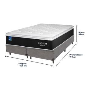 O conforto que sua casa precisa e a qualidade que você merece está na Kazamix!Descubra o colchão Magnum da Plumatex, a escolha ideal para quem busca conforto, suporte e qualidade. Com tecnologia avançada, o Magnum combina o melhor em materiais e design para proporcionar uma experiência de sono única.O colchão conta com uma camada de Malha Chronos 180 g/m², que oferece um toque macio e agradável. As Molas Ensacadas garantem suporte personalizado e distribuem o peso de forma uniforme, minimizando a transferência de movimento. A Espuma D26 oferece firmeza e conforto duradouro, enquanto o EPS Pillow Top Hig|h Tech adiciona um toque luxuoso, elevando ainda mais a experiência de descanso.Com proteção antiácaro, antialérgico e antifungo, o Magnum assegura um ambiente saudável para o seu sono. Ideal para quem deseja um colchão durável e de alta performance.Invista no seu bem-estar e experimente o conforto excepcional do Magnum.Modelo: MagnumMarca: PlumatexTamanho: QueenDimensões: 158x198X28 (Largura x Comprimento x Altura)Conforto: IntermediárioSistema: Molas EnsacadasPillow: Pillow TopPeso Máximo recomendado: 110 kg (Por pessoa)Proteções: Antiácaro, antialérgico, antifungo, antimofoGarantia: 1 ano pelo FabricanteO conforto que sua casa precisa e a qualidade que você merece está na Kazamix!Eleve o conforto e a sofisticação do seu quarto com a Cama Box!Produzida em madeira de reflorestamento reforçada, a Cama Box combina qualidade, durabilidade e um design elegante, que confere leveza e modernidade ao seu dormitório. Sua estrutura robusta suporta até 150 kg por pessoa, garantindo a sustentação perfeita para o colchão e prolongando a vida útil do produto.Com uma altura ergonômica, ela oferece maior conforto ao deitar e levantar, enquanto o acabamento de alta qualidade se adapta a qualquer estilo de decoração, unindo praticidade e estilo.Não perca tempo! Adquira agora mesmo a sua Cama Box e transforme seu dormitório com conforto e elegância.Marca: KazaMixModelo: BoxCor do Box: CinzaTamanho: QueenDimensões: 158X198X35 (Largura x Comprimento x Altura) Estrutura: MadeiraPeso máximo recomendado: 150 kg (Por Pessoa)Altura do Box: 25 cm Altura dos Pés: 10 cm Altura total: 35 cm Garantia: 03 mesesSelo Ecologicamente CorretoAtenção: Antes de finalizar sua compra, certifique-se de que as dimensões do produto sejam adequadas para serem transportadas pelos elevadores, portas, escadas e corredores de sua residência. Ressaltamos que não nos responsabilizamos pelo transporte do produto por meios específicos, como escadas, guinchos ou içamentos.