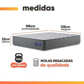 Cama Box Colchão Casal Molas Ensacadas Atlanta 138x188x60cm Apolo MEDIDAS:: A = 60 cm / 48 cm (sem pés) L = 138 cm P = 188 cm | ALTURA DOS PÉS:: 12 cm | PESO SUPORTADO POR PESSOA:: 160 kg | PESO:: 112,18 kg | MODELO:: Cama Box Colchão Casal Molas Ensacadas Atlanta 138x188x60cm Apolo | MARCA COLCHÃO:: Apolo Espumas | MARCA BOX:: Prince | REVESTIMENTO SUPERIOR E LATERAL:: Confeccionado em malha bio, oferece toque extremamente suave e agradável, proporcionando conforto desde o primeiro e melhor adaptação ao corpo e aos movimentos durante o sono. | REVESTIMENTO INTERNO:: Estrutura de molas ensacadas, que suportam até 160kg por pessoa, garantindo conforto e estabilidade ao dormir | ESPUMA:: Camada de espuma D26 dentro dos padrões ABNT, de alta qualidade, que proporciona conforto na medida certa | COLCHÃO CONTÉM:: ANTI MOFO: prolonga a vida útil do colchão, preservando a integridade e a qualidade do tecido / ANTI ALÉRGICO: proporciona noites de sono mais tranquilas, saudáveis e livres de irritações / ANTI ÁCARO: mantém o ambiente de descanso mais puro, higiênico e | OBSERVAÇÃO:: O colchão conta com uma base em EPS, um material resistente, leve e de alta durabilidade, que garante maior firmeza e prolonga a vida útil do colchão | ESTRUTURA:: Madeira de Eucalipto Pinus, resistente e duradoura | PÉS:: 12 unidades em plástico de alta resistência | ITENS INCLUSOS:: 1 colchão casal 1,38m, 1 box casal 1,38m | INTRUÇÕES E CUIDADOS:: Utilizar em seco e arejado, não dobrar, fazer giro quinzenalmente no sentido pés/cabeceira | GARANTIA BOX:: 3 meses pelo fabricante. | AIVSO: Importante sobre a : A é realizada até a portaria ou porta de entrada do indicado, desde que o acesso seja permitido. Para locais com portaria, a será feita no piso térreo. Não realizamos montagem, desmontagem, p | GARANTIA DO COLCHÃO:: 12 meses pelo fabricante | TECIDO BOX:: Suede elegante e resistente | Altura da cama principal: 60 cm | Comprimento da cama principal: 188 cm | Largura da cama principal: 138 cm | Quantidade de caixas de embalagem: 2 | Tamanho: casal | Altura da embalagem: 56 cm | Comprimento da embalagem: 188 cm | Largura da embalagem: 138 cm | Peso da embalagem: 50250 g | Cor: Cinza