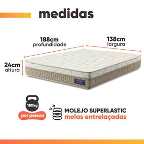 REVESTIMENTO INTERNO: Estrutura com molas Superlastic de alta resistência, projetadas para oferecer suporte firme e progressivo. Suportam até 180 kg por pessoa, garantindo excelente estabilidade, durabilidade e conforto durante o sono.