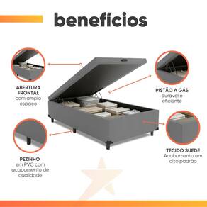 O Box é um excelente produto para você que busca um produto moderno e prático. É feito de tecido suede toque macio, possui estrutura resistente, um belo acabamento e um sistema de abertura fácil, onde você terá mais espaço para poder guardar os seus objetos pessoais, roupas de cama, travesseiros e edredons. Todo produzido com um material firme, como Eucalipto e Pinus. Proporciona para o seu quarto melhor aproveitamento de espaço e um design moderno. Deixará o ambiente mais belo e prático. Acompanha jogo de pés em PVC.