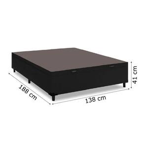 Cama Box com Baú Casal 1,38 com 41cm de Altura Prince Preto MARCA: Prince | MODELO: Box com Baú Casal | COR: Preto | MEDIDAS: A: 41 cm / 35 cm (sem pés) L: 138 cm P: 188 cm | TECIDO: Tecido PU | PESO: 58kg | PÉS: 6cm | Descrição: A Cama Box com Baú possui um sistema de abertura fácil, onde você terá mais espaço para poder você guarda os seus objetos pessoais, roupas, camas, travesseiro, edredons. Trará para o seu quarto um melhor aproveitamento de espaço. | ITENS INCLUSOS: 1 Box | OBS: Colchão e objetos decorativos não estão inclusos | Aviso: Montagem não inclusa. Entregamos até a porta de entrada da casa do cliente ou até a portaria do condomínio. Cor: Preto