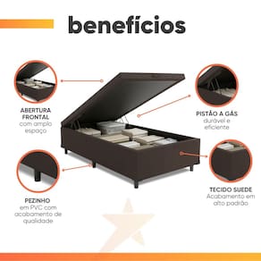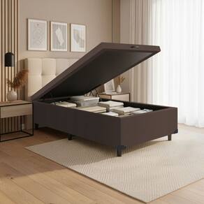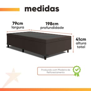 MEDIDAS: [ A ] = 41 cm / 35 cm (sem pés) [ L ] = 79 cm [ P ] = 198 cm PESO: 42kg PÉS: 6 cm MODELO: Box com Baú Solteiro MARCA: Prince COR: Marrom MATERIAL DA ESTRUTURA: MDP TECIDO: Suede ITENS INCLUSOS: 1 Box GARANTIA: 03 meses