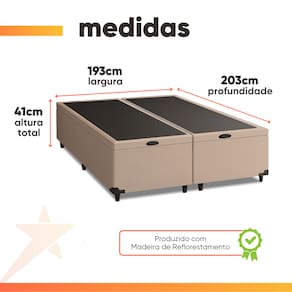 A Cama Box Bipartida com Baú é a escolha ideal para quem busca praticidade, conforto e um toque moderno no quarto. Com estrutura resistente em madeira de eucalipto e pinus, ela oferece durabilidade e segurança, além de um belo acabamento em tecido suede, fácil de limpar e extremamente elegante. Seu sistema de abertura fácil do baú permite um aproveitamento inteligente do espaço, ideal para guardar roupas, travesseiros, edredons e objetos pessoais, mantendo tudo sempre organizado. Por ser bipartida, também facilita o transporte e a instalação, principalmente em ambientes com espaços mais reduzidos. Além disso, acompanha jogo de pés em PVC, garantindo estabilidade e completando o visual moderno do móvel. A Cama Box com Baú é perfeita para transformar seu quarto em um ambiente mais bonito, funcional e acolhedor.