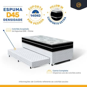 Espuma D45 (colchão principal), Espuma D28 (colchão auxiliar), EPS Poliestireno Expansível (camada de suporte), Tecido (pode variar, mas a cor predominante é bege).Vendido e entregue por LUCAS HOME