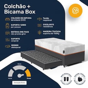 E que tal a base com cama auxiliar integrada? A base bicama inclui uma cama auxiliar fixa com molas ensacadas, proporcionando um suporte firme e ortopédico, ideal para quem precisa de um apoio adicional. A cama oferece uma solução prática para otimizar o uso do espaço, facilitando o acesso e o conforto no quarto.
