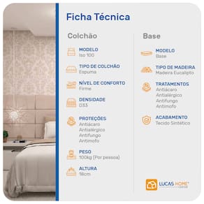 Complementando este colchão, a base box é feita de madeira tratada e revestida, suportando até 150 Kg por pessoa. Ela não só eleva seu colchão a uma altura ideal para fácil acesso, mas também estabiliza seu sono com uma fundação sólida e confiável. Esta combinação não apenas maximiza seu conforto, mas também a funcionalidade do seu espaço de descanso.