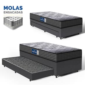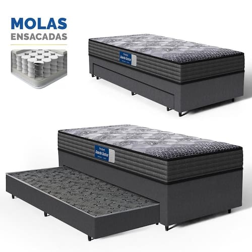 E que tal a base com cama auxiliar integrada? A base bicama inclui uma cama auxiliar fixa com molas ensacadas, proporcionando um suporte firme e ortopédico, ideal para quem precisa de um apoio adicional. A cama oferece uma solução prática para otimizar o uso do espaço, facilitando o acesso e o conforto no quarto.