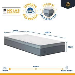 Deseja conforto extra e suporte individualizado? Nosso colchão com Molas Ensacadas e Pillow In oferece uma camada de conforto que se adapta ao seu corpo, aliviando pontos de pressão para um sono revigorante. Ideal para quem busca maciez e suporte duradouro, com capacidade para até 120 kg por pessoa.