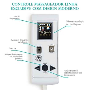 1 controle com Massageador de 8 motores e 1 controle com tela LCD , 1.000 tipos de massagens, Função Bilateral onde você poderá escolher o lado que irá fazer a massagem ou no colchão todo, despertador, 10 níveis de potencias, 4 pontos programáveis até 50 minutos consecutivos de massagem.