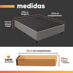 Importante sobre a : A é realizada até a portaria ou porta de entrada do indicado, desde que o acesso seja permitido. Para locais com portaria, a será feita no piso térreo. Não realizamos montagem, desmontagem, por escadas ou içamento. É responsabilidade do cliente verificar se as dimensões do produto são compatíveis com portas, elevadores e corredores. Evite imprevistos: confira todos os detalhes antes de concluir sua compra. MEDIDAS DO BOX:: [ A ] = 44 cm / 32 cm (Sem pés) [ L ] = 193 cm [ P ] = 203 cm | MEDIDAS INTERNAS DO BAÚ:: [ A ] = 26 cm [ L ] = 180 cm [ P ] = 193 cm | ALTURA DOS PÉS:: 12 cm | IDEAL PARA COLCHÃO DE ATÉ:: 193 cm | PESO:: 46Kg | SUPORTA ATÉ:: 120Kg por pessoa | MODELO:: Box Baú Base Casal King para Colchão de Desmontável | MARCA:: Sider | POSSUI PÉS:: Sim | MATERIAL DOS PÉS:: Polipropileno | QUANTIDADE DOS PÉS:: 9 | MATERIAL DA ESTRUTURA:: Eucalipto tratado reflorestado | ESPESSURA DO MATERIAL DA ESTRUTURA:: 2 cm | REVESTIMENTO:: Tecido Suede | ACOMPANHA COLCHÃO:: Não | DESMONTÁVEL:: Sim | DIFERENCIAL:: Praticidade no , armazenagem e montagem | GARANTIA:: 3 meses | ITENS INCLUSOS:: 1 Manual de montagem e 1 Box Baú | AVISO:: Importante sobre a : A é realizada até a portaria ou porta de entrada do indicado, desde que o acesso seja permitido. Para locais com portaria, a será feita no piso térreo. | Inclui manual de montagem: sim | Requer montagem: sim | Tamanho: King | Cor: Cinza