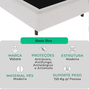 A tecnologia que a sua casa merece está na V-Store!A Base Box Bravus da V-Store une funcionalidade e elegância, sendo a escolha perfeita para quem busca praticidade e durabilidade. Feita com madeira reflorestada, ela oferece excelente sustentação para o seu colchão, enquanto seu revestimento em tecido sintético garante resistência e facilidade de manutenção. Seu design compacto e sofisticado complementa a decoração do quarto com estilo.Com capacidade para 150 kg por pessoa e Selo Ecologicamente Correto, a Base Box Bravus oferece resistência, sustentabilidade e versatilidade para o seu ambiente.Adquira já a sua Base Box Bravus V-Store e transforme seu dormitório com qualidade e estilo!CARACTERÍSTICAS DO PRODUTOMarca: V-StoreModelo: BravusCor do Box: BrancoTamanho: KingDimensões: 193x44x203 (Largura x Altura x Comprimento)Estrutura: MadeiraPeso máximo recomendado: 150 kg (Por Pessoa)Altura do Box: 26 cmAltura dos Pés: 6 cmAltura total: 44 cmGarantia: 12 Meses (Estrutura) / 3 meses (Tecido)Selo Ecologicamente CorretoAtenção:- Antes de finalizar sua compra, recomendamos que verifique se as dimensões do produto são adequadas para serem transportadas pelos elevadores, portas, escadas e corredores de sua residência. Ressaltamos que não nos responsabilizamos pelo transporte do produto por meios específicos, como escadas, guinchos ou içamentos.- É possível que hajam leves variações de cor de acordo com o dispositivo que está sendo utilizado como smartphones, computadores, monitores e outros.
