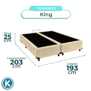 Base Box King Universal em Veludo – Conforto, Estilo e Estrutura para Seu QuartoRevestimento em veludo, com acabamento sofisticado e toque aveludadoMedidas Queen: 193x203cm, ideal para colchões maiores e mais espaçososEstrutura reforçada com suporte de até 150kg, garantindo segurança e durabilidadeAltura total de 42cm, proporcionando presença e conforto no ambientePés em madeira com 13cm, oferecendo firmeza e estabilidade ao conjuntoLeve e funcional: com apenas 20kg, facilita o transporte e a montagemExcelente escolha para quartos residenciais e acomodações refinadasFicha Técnica Cama Box:Modelo: UniversalMarca: NatureTamanho: KingTecido: VeludoLargura: 193cmComprimento: 203cmAltura: 25cmAltura dos Pés: 13cmMaterial dos Pés: MadeiraSuporte de Peso: 150KgPeso: 40KgGarantia: 3 MesesAtenção:Antes da compra certifique-se de que o produto passa por elevadores, portas e corredores.As transportadoras não realizam entregas por escadas ou içamentos.Caso o item não caiba no elevador, a entrega será considerada concluída no térreo do prédio.A cor e tonalidade do produto pode variar de acordo com o dispositivo que o usuário está acessando.