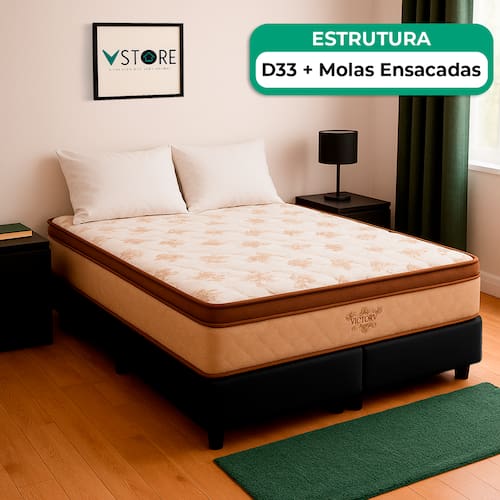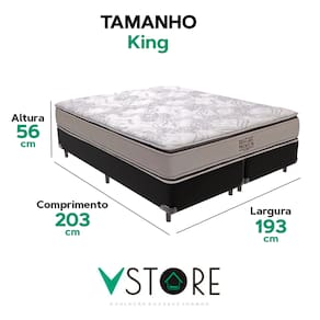 A tecnologia que a sua casa merece está na V-Store! O Conjunto Colchão Four Seasons e Base Box Bravus oferece o equilíbrio perfeito entre conforto e funcionalidade. O colchão, com molas ensacadas, pillow top e EPS, garante excelente suporte e conforto térmico, ideal para casais. Já a base, feita de madeira reflorestada e revestida em tecido sintético, oferece durabilidade e praticidade, com amplo espaço para armazenamento.Característica Do Colchão: Modelo: Four SeasonMarca: V-StoreTamanho: KingDimensões: 193x30x203 (Largura x Altura x Comprimento)Conforto: MédioSistema: Molas EnsacadasPillow: Pillow TopPeso Máximo recomendado: 150 kg (Por pessoa)Proteções: Antiácaro, antialérgico, antifungo, antimofoGarantia: 12 Meses (Espuma) / 10 anos ( Conjunto de Molas Ensacadas)Característica Da Base: Marca: V-StoreModelo: BravusCor do Box: PretoTamanho: KingDimensões: 193x44x203 (Largura x Altura x Comprimento)Estrutura: MadeiraPeso máximo recomendado: 150 kg (Por Pessoa)Altura do Box: 26 cmAltura dos Pés: 6 cmAltura total: 44 cmGarantia: 12 Meses (Estrutura) / 3 meses (Tecido)Selo Ecologicamente CorretoAtenção:- Antes de finalizar sua compra, recomendamos que verifique se as dimensões do produto são adequadas para serem transportadas pelos elevadores, portas, escadas e corredores de sua residência. Ressaltamos que não nos responsabilizamos pelo transporte do produto por meios específicos, como escadas, guinchos ou içamentos.- É possível que hajam leves variações de cor de acordo com o dispositivo que está sendo utilizado como smartphones, computadores, monitores e outros.