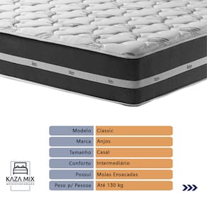 O conforto que sua casa precisa e a qualidade que você merece está na Kazamix!Descubra o Colchão Classic da Anjos, a combinação perfeita de funcionalidade, conforto e durabilidade. Com design clean e moderno, sua superfície plana proporciona um toque de elegância ao ambiente, enquanto as molas ensacadas garantem um suporte individualizado, ideal para um descanso tranquilo e sem transferência de movimento.Este modelo oferece conforto intermediário, adaptando-se às mais variadas preferências. Com tratamento antiácaro e antialérgico, o Classic cria um ambiente mais saudável e seguro para o seu sono. Um colchão de alta densidade que une qualidade e custo-benefício, perfeito para quem valoriza bem-estar e sofisticação. Transforme suas noites com o conforto que você merece!Modelo: Classic 26 PretoMarca: AnjosTamanho: CasalDimensões: 138x188X26 (Largura x Comprimento x Altura)Conforto: IntermediárioSistema: Molas ensacadas Pillow: Não se AplicaPeso Máximo recomendado: 130 kg (Por pessoa)Proteções: Antiácaro, antialérgico, antifungo, antimofoGarantia: 1 ano pelo FabricanteO conforto que sua casa precisa e a qualidade que você merece está na Kazamix!Eleve o conforto e a sofisticação do seu quarto com a Cama Box!Produzida em madeira de reflorestamento reforçada, a Cama Box combina qualidade, durabilidade e um design elegante, que confere leveza e modernidade ao seu dormitório. Sua estrutura robusta suporta até 150 kg por pessoa, garantindo a sustentação perfeita para o colchão e prolongando a vida útil do produto.Com uma altura ergonômica, ela oferece maior conforto ao deitar e levantar, enquanto o acabamento de alta qualidade se adapta a qualquer estilo de decoração, unindo praticidade e estilo.Não perca tempo! Adquira agora mesmo a sua Cama Box e transforme seu dormitório com conforto e elegância.Marca: KazaMixModelo: BoxCor do Box: MarromTamanho: CasalDimensões: 138X188X35 (Largura x Comprimento x Altura) Estrutura: MadeiraPeso máximo recomendado: 150 kg (Por Pessoa)Altura do Box: 25 cm Altura dos Pés: 10 cm Altura total: 35 cm Garantia: 03 mesesSelo Ecologicamente CorretoAtenção: Antes de finalizar sua compra, certifique-se de que as dimensões do produto sejam adequadas para serem transportadas pelos elevadores, portas, escadas e corredores de sua residência. Ressaltamos que não nos responsabilizamos pelo transporte do produto por meios específicos, como escadas, guinchos ou içamentos.
