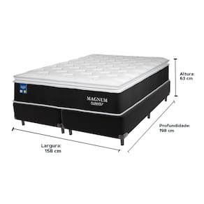 O conforto que sua casa precisa e a qualidade que você merece está na Kazamix!Descubra o colchão Magnum da Plumatex, a escolha ideal para quem busca conforto, suporte e qualidade. Com tecnologia avançada, o Magnum combina o melhor em materiais e design para proporcionar uma experiência de sono única.O colchão conta com uma camada de Malha Chronos 180 g/m², que oferece um toque macio e agradável. As Molas Ensacadas garantem suporte personalizado e distribuem o peso de forma uniforme, minimizando a transferência de movimento. A Espuma D26 oferece firmeza e conforto duradouro, enquanto o EPS Pillow Top Hig|h Tech adiciona um toque luxuoso, elevando ainda mais a experiência de descanso.Com proteção antiácaro, antialérgico e antifungo, o Magnum assegura um ambiente saudável para o seu sono. Ideal para quem deseja um colchão durável e de alta performance.Invista no seu bem-estar e experimente o conforto excepcional do Magnum.Modelo: MagnumMarca: PlumatexTamanho: QueenDimensões: 158x198X28 (Largura x Comprimento x Altura)Conforto: IntermediárioSistema: Molas EnsacadasPillow: Pillow TopPeso Máximo recomendado: 110 kg (Por pessoa)Proteções: Antiácaro, antialérgico, antifungo, antimofoGarantia: 1 ano pelo FabricanteO conforto que sua casa precisa e a qualidade que você merece está na Kazamix!Eleve o conforto e a sofisticação do seu quarto com a Cama Box!Produzida em madeira de reflorestamento reforçada, a Cama Box combina qualidade, durabilidade e um design elegante, que confere leveza e modernidade ao seu dormitório. Sua estrutura robusta suporta até 150 kg por pessoa, garantindo a sustentação perfeita para o colchão e prolongando a vida útil do produto.Com uma altura ergonômica, ela oferece maior conforto ao deitar e levantar, enquanto o acabamento de alta qualidade se adapta a qualquer estilo de decoração, unindo praticidade e estilo.Não perca tempo! Adquira agora mesmo a sua Cama Box e transforme seu dormitório com conforto e elegância.Marca: KazaMixModelo: BoxCor do Box: PretoTamanho: QueenDimensões: 158X198X35 (Largura x Comprimento x Altura) Estrutura: MadeiraPeso máximo recomendado: 150 kg (Por Pessoa)Altura do Box: 25 cm Altura dos Pés: 10 cm Altura total: 35 cm Garantia: 03 mesesSelo Ecologicamente CorretoAtenção: Antes de finalizar sua compra, certifique-se de que as dimensões do produto sejam adequadas para serem transportadas pelos elevadores, portas, escadas e corredores de sua residência. Ressaltamos que não nos responsabilizamos pelo transporte do produto por meios específicos, como escadas, guinchos ou içamentos.