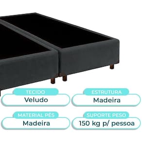 Modelo: Universal Marca: Nature Tamanho: Queen Tecido: Veludo Largura: 158cm Comprimento: 198cm Altura: 25cm Altura dos Pés: 13cm Material dos Pés: Madeira Suporte de Peso: 150Kg Peso: 30Kg Garantia: 3 Meses