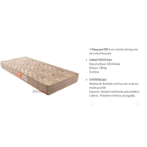 Dimensões(Cm): Comnto(Profundidade): 198cm x Largura: 158cm x Altura: 25cm Tipo de Bordado do Tecido de Revestimento - Matelassê Tipo Tecido de Forração Revestimento - Poliéster - Granitê Tecido com Tratamento - AntiÁcaro e AntiFungo Modo de Utilização - Double Side Tipo de Estrutura do Bloco de Espuma - D33 Camadas Interna do Estofamento de Espuma - Alta Qualidade Peso Máximo Suportado - 110 kg Tipo de Conforto - Macio c/ Firmeza Certificados de Qualidade - Qualidade Aprovada - Qualidade Costa Rica - INMETRO Vantagens Extras do colchão D33 - Ecologicamente Correto Nossa Avaliação - Qualidade Muito Boa Tempo de Garantia - 12 meses