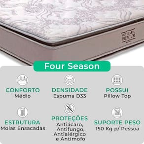 O Conjunto Colchão Four Seasons e Base Box Bravus oferece o equilíbrio perfeito entre conforto e funcionalidade. O colchão, com molas ensacadas, pillow top e EPS, garante excelente suporte e conforto térmico, ideal para casais. Já a base, feita de madeira reflorestada e revestida em tecido sintético, oferece durabilidade e praticidade, com amplo espaço para armazenamento.