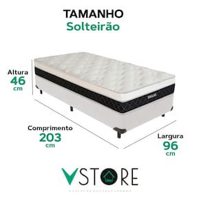 A tecnologia que a sua casa merece está na V-Store! O Conjunto Colchão Dallas e Base Box Bravus oferece a combinação perfeita de conforto, durabilidade e estilo. O Colchão Dallas, com molas ensacadas, espuma D33, Euro Pillow e tecnologia EPS, proporciona excelente suporte e conforto térmico. Já a Base Box Bravus, feita com madeira reflorestada e revestida com tecido sintético, garante resistência, durabilidade e um design sofisticado que complementa qualquer ambiente. Ideal para quem busca praticidade e elegância no quarto. Adquira já a sua Base Box Bravus V-Store e transforme seu dormitório com qualidade e estilo!Característica Do Colchão: Modelo: DallasMarca: V-StoreTamanho: SolteirãoDimensões: 96x20x203 (Largura x Altura x Comprimento)Conforto: MédioSistema: Molas EnsacadasPillow: Euro PillowPeso Máximo recomendado: 150 kg (Por pessoa)Proteções: Antiácaro, antialérgico, antifungo, antimofoGarantia: 12 Meses (Espuma) / 10 anos ( Conjunto de Molas Ensacadas)Característica Da Base: Marca: V-StoreModelo: BravusCor do Box: BrancoTamanho: SolteirãoDimensões: 96x44x203 (Largura x Altura x Comprimento)Estrutura: MadeiraPeso máximo recomendado: 150 kg (Por Pessoa)Altura do Box: 26 cmAltura dos Pés: 6 cmAltura total: 44 cmGarantia: 12 Meses (Estrutura) / 3 meses (Tecido)Selo Ecologicamente CorretoAtenção:- Antes de finalizar sua compra, recomendamos que verifique se as dimensões do produto são adequadas para serem transportadas pelos elevadores, portas, escadas e corredores de sua residência. Ressaltamos que não nos responsabilizamos pelo transporte do produto por meios específicos, como escadas, guinchos ou içamentos.- É possível que hajam leves variações de cor de acordo com o dispositivo que está sendo utilizado como smartphones, computadores, monitores e outros.