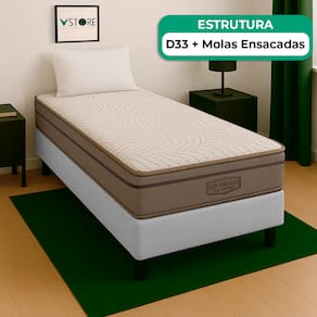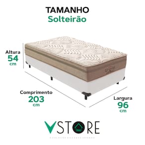 A tecnologia que a sua casa merece está na V-Store! O Conjunto Colchão Los Angeles + Base Box Baú Bravus da V-Store oferece conforto e funcionalidade. O colchão, com molas ensacadas e sistema EPS, garante suporte ideal, conforto térmico e proteção antiácaro. A base box, com amplo espaço de armazenamento, é feita de madeira reflorestada e revestida com tecido resistente, proporcionando praticidade e sofisticação ao seu quarto.Característica Do Colchão: Modelo: Los AngelesMarca: V-StoreTamanho: SolteirãoDimensões: 96x28x203 (Largura x Altura x Comprimento)Conforto: MédioSistema: Molas EnsacadasPillow: Não se aplicaPeso Máximo recomendado: 150 kg (Por pessoa)Proteções: Antiácaro, antialérgico, antifungo, antimofoGarantia: 12 Meses (Espuma) / 10 anos ( Conjunto de Molas Ensacadas)Característica Da Base: Marca: V-StoreModelo: BravusTamanho: SolteirãoDimensões: 96x44x203 (Largura x Altura x Comprimento)Estrutura: MadeiraPeso máximo recomendado: 150 kg (Por Pessoa)Altura do Box: 26 cmAltura dos Pés: 6 cmAltura total: 44 cmGarantia: 12 Meses (Estrutura) / 3 meses (Tecido)Selo Ecologicamente CorretoAtenção:- Antes de finalizar sua compra, recomendamos que verifique se as dimensões do produto são adequadas para serem transportadas pelos elevadores, portas, escadas e corredores de sua residência. Ressaltamos que não nos responsabilizamos pelo transporte do produto por meios específicos, como escadas, guinchos ou içamentos.- É possível que hajam leves variações de cor de acordo com o dispositivo que está sendo utilizado como smartphones, computadores, monitores e outros.