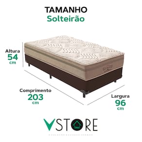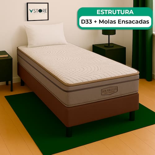 A tecnologia que a sua casa merece está na V-Store! O Conjunto Colchão Los Angeles + Base Box Baú Bravus da V-Store oferece conforto e funcionalidade. O colchão, com molas ensacadas e sistema EPS, garante suporte ideal, conforto térmico e proteção antiácaro. A base box, com amplo espaço de armazenamento, é feita de madeira reflorestada e revestida com tecido resistente, proporcionando praticidade e sofisticação ao seu quarto.Característica Do Colchão: Modelo: Los AngelesMarca: V-StoreTamanho: SolteirãoDimensões: 96x28x203 (Largura x Altura x Comprimento)Conforto: MédioSistema: Molas EnsacadasPillow: Não se aplicaPeso Máximo recomendado: 150 kg (Por pessoa)Proteções: Antiácaro, antialérgico, antifungo, antimofoGarantia: 12 Meses (Espuma) / 10 anos ( Conjunto de Molas Ensacadas)Característica Da Base: Marca: V-StoreModelo: BravusTamanho: SolteirãoDimensões: 96x44x203 (Largura x Altura x Comprimento)Estrutura: MadeiraPeso máximo recomendado: 150 kg (Por Pessoa)Altura do Box: 26 cmAltura dos Pés: 6 cmAltura total: 44 cmGarantia: 12 Meses (Estrutura) / 3 meses (Tecido)Selo Ecologicamente CorretoAtenção:- Antes de finalizar sua compra, recomendamos que verifique se as dimensões do produto são adequadas para serem transportadas pelos elevadores, portas, escadas e corredores de sua residência. Ressaltamos que não nos responsabilizamos pelo transporte do produto por meios específicos, como escadas, guinchos ou içamentos.- É possível que hajam leves variações de cor de acordo com o dispositivo que está sendo utilizado como smartphones, computadores, monitores e outros.