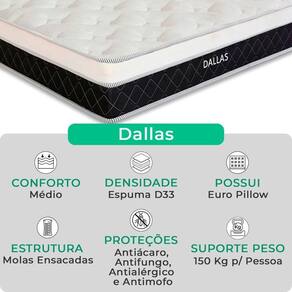 O Conjunto Colchão Dallas e Base Box Bravus oferece a combinação perfeita de conforto, durabilidade e estilo. O Colchão Dallas, com molas ensacadas, espuma D33, Euro Pillow e tecnologia EPS, proporciona excelente suporte e conforto térmico. Já a Base Box Bravus, feita com madeira reflorestada e revestida com tecido sintético, garante resistência, durabilidade e um design sofisticado que complementa qualquer ambiente. Ideal para quem busca praticidade e elegância no quarto.