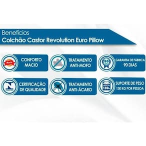 Colchão Castor Casal Revolution Molas Tecnopedic System características técnicas - Altura (Colchão): 30cm - Biotipos (por pessoa): Até 130Kg - Conforto: Intermediário - Medida: 088 x 188cm - Tamanho: Casal - Tecnologia: Mola Tecnopedic garantia do produto - Molejo: 12 meses - Estofamento: 12 meses - Tecido: 90 dias estrutura interna Armação com Tecnologia Suça: - As molas tipo bonnel system (tecnopedic) - Colagem das molas tipo hot melt- Proporciona maior individualidade das molas; - Bordas perimetrais em Espuma Resistente; - Revestida por feltro 700 Gr/m2 ou espuma em toda a armação proporcionando maior estabilidade naarmação. Enchimento Interno: - 01 lâmina de espuma D26 com 5,0 cm de espessura; - 01 lâmina de espuma D20 com 3,0 cm de espessura. estrutura externa Faixa Lateral do colchão: - Tecido 69% poliéster 31% polipropileno; - Etiqueta tipo tecido (Frontal) com características do Colchão - Etiqueta tipo lingueta com características do Colchão. Saia Lateral do Colchão: - Tecido 100% Poliester, 173 gr/m². Tampão superior: - Tecido 69% polipropileno e 31% poliéster, 179,55 gr/m²; - 02 lâminas de espuma de Poliuretano com 1,7 cm de espessura; - Bordado tipo – Ribon; - Acabamento com debrum de 40 mm c/ dourado. Tampão inferior: - Tecido 67% Polipropileno 33% Poliester, 109,55 gm/m², Cetim bege liso; - Obs.: Na versão Double face o tampo inferior é igual ao superior. Especificações Técnicas Base Box: Cama box Blindada com Chapa de Madeira - Super reforçada - Marca: Dreams Box; - Material: Madeira tratada; - Peso máximo recomendado: até 150 Kg (por pessoa); - Altura da base: 25cm; - Altura dos pés: 10cm; - Revestimento: Tecido Sintético; - Pezinhos de Madeira - Garantia: 12 meses na estrutura e 3 meses no tecido; - Dimensões do produto (largura x comprimento x altura) Casal: 088x188x35cm; Ean: 7803177373396