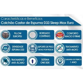 Abaixo segue os produtos do KIT: Conjunto Box Solteiro: Colchão Espuma Castor D33 Sleep Max + Base CRC Courano White(88x188)