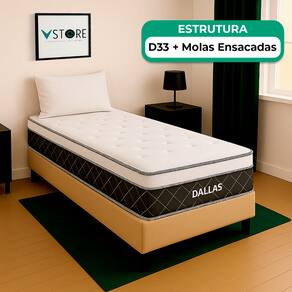 A tecnologia que a sua casa merece está na V-Store! O Conjunto Colchão Dallas e Base Box Bravus oferece a combinação perfeita de conforto, durabilidade e estilo. O Colchão Dallas, com molas ensacadas, espuma D33, Euro Pillow e tecnologia EPS, proporciona excelente suporte e conforto térmico. Já a Base Box Bravus, feita com madeira reflorestada e revestida com tecido sintético, garante resistência, durabilidade e um design sofisticado que complementa qualquer ambiente. Ideal para quem busca praticidade e elegância no quarto. Adquira já a sua Base Box Bravus V-Store e transforme seu dormitório com qualidade e estilo!Característica Do Colchão: Modelo: DallasMarca: V-StoreTamanho: SolteiroDimensões: 88x20x188 (Largura x Altura x Comprimento)Conforto: MédioSistema: Molas EnsacadasPillow: Euro PillowPeso Máximo recomendado: 150 kg (Por pessoa)Proteções: Antiácaro, antialérgico, antifungo, antimofoGarantia: 12 Meses (Espuma) / 10 anos ( Conjunto de Molas Ensacadas)Característica Da Base: Marca: V-StoreModelo: BravusTamanho: SolteiroDimensões: 88x44x188 (Largura x Altura x Comprimento)Estrutura: MadeiraPeso máximo recomendado: 150 kg (Por Pessoa)Altura do Box: 26 cmAltura dos Pés: 6 cmAltura total: 44 cmGarantia: 12 Meses (Estrutura) / 3 meses (Tecido)Selo Ecologicamente CorretoAtenção:- Antes de finalizar sua compra, recomendamos que verifique se as dimensões do produto são adequadas para serem transportadas pelos elevadores, portas, escadas e corredores de sua residência. Ressaltamos que não nos responsabilizamos pelo transporte do produto por meios específicos, como escadas, guinchos ou içamentos.- É possível que hajam leves variações de cor de acordo com o dispositivo que está sendo utilizado como smartphones, computadores, monitores e outros.