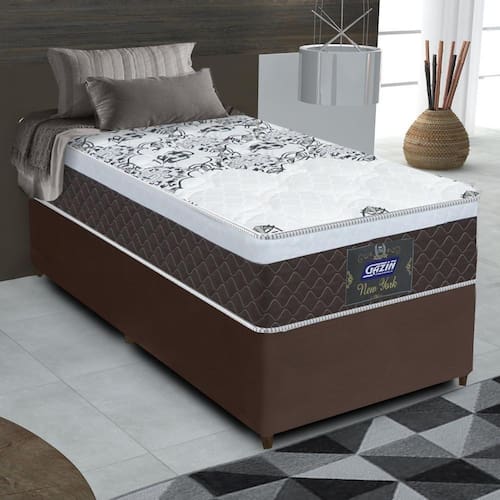 Cama Box Solteiro Molas Ensacadas New York 88x188x66cm MODELO: Cama Box New York Solteiro 0,88m | MARCA: Gazin | MARCA DO BOX: Prince | COR: Marrom / Branco | MEDIDAS CAMA BOX: A: 64 cm L: 88 cm P: 188 cm | MOLEJO: Molas Ensacadas Soft Pillow. Não possuem atrito entre si, oferecendo ausência completa de ruídos. Além disso, agem em conjunto com a espuma e garantem maior firmeza e conforto ao colchão. Como são independentes, a pressão é localizada, ou seja, cada mola | EURO: Sim, Euro IN. | REVESTIMENTO SUPERIOR: Revestimento superior em tecido poliéster, tecido 100% sintético. Por ser sintético não é propenso ao acúmulo de poeira e materiais orgânicos, além de ser de fácil higienização. Produto com ótimo custo benefício. | REVESTIMENTO LATERAL: Revestimento lateral em tecido poliéster, tecido 100% sintético. Por ser sintético não é propenso ao acúmulo de poeira e materiais orgânico, além de ser de fácil higienização. | REVESTIMENTO INFERIOR: Tecido Antiderrapante, Tecido 100% poliéster, com detalhes emborrachados. Evita que o colchão deslize sobre a base, trazendo maior segurança e conforto para o sono. | TECIDO DO BOX: Suede | MATERIAL DO BOX: 85% Eucalipto e 15% Pinus | ALTURA DOS PÉS: 12cm | DIFERENCIAL: Produto com ótimo custo benefício, utilizando em sua estrutura o molejo Soft Pillow que proporciona conforto e bem estar | PESO: 32kg | PESO SUPORTADO: 110kg | INSTRUÇÕES / CUIDADOS: Utilizar em local seco com passagem de ar, não dobrar, fazer giro quinzenalmente no sentido pés/cabeceira. Produto utilizável apenas de um lado. | ITENS INCLUSOS: 1 colchão de 0,88m e 1 box de 0,88m | GARANTIA: 12 Meses pelo Fabricante | OBS.:: Montagem não inclusa. Entregamos até a porta de entrada da casa do cliente ou até a portaria do condomínio. | PRODUTO: Cama Box Solteiro | CLASSIFICAÇÃO DA CAMA: Solteiro Cor: Marrom / Branco