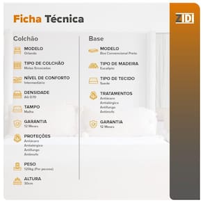 Caracteristicas do Box: * Estrutura Interna em Madeira de Eucalipto 100 de Reflorestamento * Estrutura Externa Em Tecido Suede * Pes em Plastico de 12 cm * Tratamento Antiacaro e Antialergico * Possui Tecido Antiderrapante * Suporte de ate 120 Kg por Pessoa * Necessita Montagem dos Pes. * Garantia do Fornecedor: 03 Meses