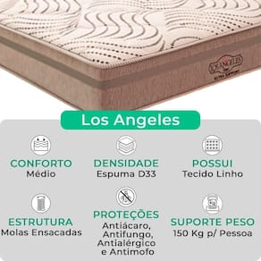 O Conjunto Colchão Los Angeles + Base Box Baú Bravus da V-Store oferece conforto e funcionalidade. O colchão, com molas ensacadas e sistema EPS, garante suporte ideal, conforto térmico e proteção . A base box, com amplo espaço de armazenamento, é feita de madeira reflorestada e revestida com tecido resistente, proporcionando praticidade e sofisticação ao seu quarto.