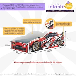 O adesivo já aplicado forma a imagem de um carro nas partes frontal e laterais do móvel, sendo uma porta aberta para a imaginação do seu filho. Seja o protagonista de emocionantes corridas ou viagens ao infinito - cada detalhe foi pensado para estimular muita diversão e momentos de pura criatividade.