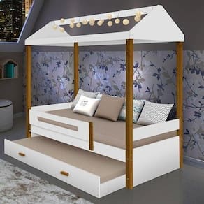 Cama Casa Sara Brancocom Cordão de Luzes LED e Cama Auxiliar com 2 colchões