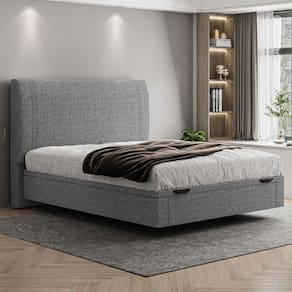 Cama com base baú, abertura pistão a gás e excelente espaço de armazenamento.