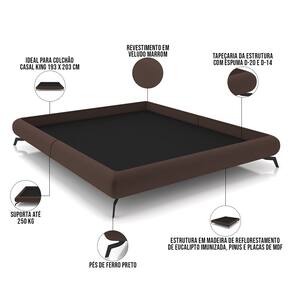 Características: Estrutura em madeira de reflorestamento de eucalipto imunizada contra mofo, cupim e micro-organismos, pinus e placas de MDF. Revestimento em Veludo na cor Marrom. Tapeçaria da estrutura com espuma D-20 e D-14. Ideal para colchão casal king 193 x 203 cm. Não acompanha colchão e cabeceira. Pés de madeira. Peso suportado: Até 250 kg.