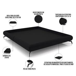 Características: Estrutura em madeira de reflorestamento de eucalipto imunizada contra mofo, cupim e micro-organismos, pinus e placas de MDF. Revestimento em Veludo na cor Preto. Tapeçaria da estrutura com espuma D-20 e D-14. Ideal para colchão casal king 193 x 203 cm. Não acompanha colchão e cabeceira. Pés de madeira. Peso suportado: Até 250 kg.