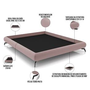 Características: Estrutura em madeira de reflorestamento de eucalipto imunizada contra mofo, cupim e micro-organismos, pinus e placas de MDF. Revestimento em Veludo na cor Rosê. Tapeçaria da estrutura com espuma D-20 e D-14. Ideal para colchão casal king 193 x 203 cm. Não acompanha colchão e cabeceira. Pés de madeira. Peso suportado: Até 250 kg.