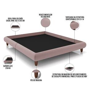 Características: Estrutura em madeira de reflorestamento de eucalipto imunizada contra mofo, cupim e micro-organismos, pinus e placas de MDF. Revestimento em Veludo na cor Rosê. Tapeçaria da estrutura com espuma D-20 e D-14. Ideal para colchão casal king 193 x 203 cm. Não acompanha colchão e cabeceira. Pés de madeira. Peso suportado: Até 250 kg.