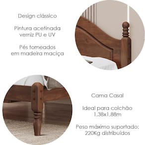 Cama Casal com design clássico e atemporal, agregando charme e sofisticação ao ambiente. Produzida em madeira maciça de pinus de reflorestamento, garante resistência e durabilidade. Sua pintura acetinada com verniz PU e UV proporciona um acabamento refinado e proteção extra, realçando a beleza natural da madeira, enquanto os pés torneados em madeira maciça adicionam um toque de elegância e robustez à estrutura. Desenvolvida para agregar conforto e beleza para o seu ambiente de descanso. Ideal para colchão de casal tamanho 1,38x1,88m. Não acompanha colchão. Este móvel chegará em sua casa separado em 04 volumes.
