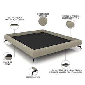 SizeDescription: Largura: 176 cm x Altura: 28 cm x Profundidade: 210 cm | Requer montagem: Sim | Tamanho da cama: Queen | ProductWeight: 58 kg | Tipo de cama: Estofada | ColorSupplier: Bege | Cor: Bege | Model: Otto | MaterialFamily: Madeira de Eucalipto, Espuma | ProductHeight: 28 cm | Peso: 58 kg | Altura: 28 cm | OriginCountry: | Modelo: Otto | ProductContents: 01 Cama | OriginState: PR | ProductWarranty: 90 dias após o do produto | ProductWidth: 176 cm | ProductLength: 210 cm | Largura: 176 cm | Material: Madeira de Eucalipto, Espuma | Color: Bege | ColorFamily: Bege | Peso máximo suportado por cama: 250 kg | ProductInstructions: Produto para uso em ambiente interno, nao devendo ficar exposto ao sol, calor e umidade excessivos. | SupplierSimpleName: Cama Casal Queen Pés de Ferro Estilo Industrial 176cm Otto P05 Linho Bege - Lyam Decor | ColorSimple: Bege