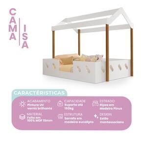 Pensada no conceito montessoriano, a Cama Isa possui estrutura mais baixa, facilitando o acesso e promovendo mais autonomia para os pequenos no dia a dia. Seu estilo moderno e delicado na cor branca combina facilmente com diversos tipos de decoração, criando um espaço harmonioso e acolhedor.