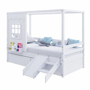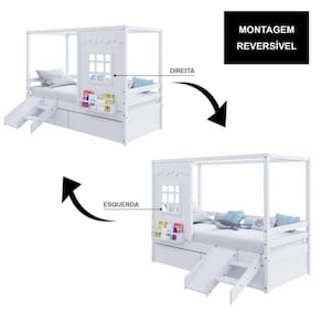 Diferenciais: 02 Gavetas, Kit Escada/ Escorregador, Casinha com fechamento em MDF, Janela e Prateleira para Livros e Decoração, Montagem Reversível (Lado Direito ou Lado Esquerdo)