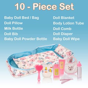- O conjunto inclui – O conjunto de bonecas consiste em uma bolsa de brinquedos, um cobertor de boneca, um travesseiro de boneca e um conjunto de acessórios para bonecas (mamadeira de leite, fralda de boneca, lenço de boneca, babador de boneca, pente de boneca, tubo de loção corporal e garrafa de pó de boneca).