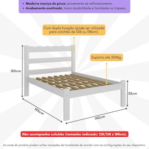 Eleve o conforto e a elegância do seu quarto com a Cama de Casal Madeira Maciça para Colchão 128/138x188cm Multimóveis CR35255. Produzida em madeira de pinus (estrado em eucalipto) proveniente de reflorestamento, esta cama é um exemplo de durabilidade e respeito ao meio ambiente. Seu acabamento em verniz (cor branca possui acabamento em laca) traz um toque sofisticado ao ambiente, enquanto a estrutura robusta suporta até 200kg, garantindo segurança e estabilidade para noites tranquilas. Com dupla furação, a cama é versátil e pode ser utilizada com colchões de 128cm ou 138cm de largura, adaptando-se perfeitamente às suas necessidades. Ideal para casais ou para quem busca um espaço aconchegante e funcional, a cama Multimóveis é a escolha certa para transformar o seu quarto em um verdadeiro refúgio de descanso. NÃO acompanha colchão (tamanho indicado: 128/138x188cm).