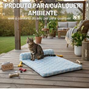 Formato Colchonete com Apoio de Cabeça: Design plano e espaçoso que permite ao pet se esticar completamente. Conta com um "rolinho" (travesseiro) na ponta, oferecendo o suporte anatômico perfeito para a cabeça e pescoço. Fundo 100% Impermeável e Anti-Friagem: A base possui uma tecnologia que isola a temperatura do chão. Isso bloqueia a friagem (ideal para pisos gelados) e protege o enchimento contra umidade ou líquidos acidentais. Enchimento Premium em Fibra Siliconada: Tanto a base quanto o travesseiro são preenchidos com fibra siliconada macia, que não deforma e mantém o conforto por muito mais tempo. Tecido Resistente e Prático: O acabamento em trama de poliéster (fios pequenos trançados) não é felpudo. Isso evita que a cama fique cheia de pelos presos e facilita a remoção de poeira.