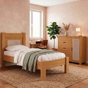 Cama de Solteiro e Comoda Clara, desenvolvida para valorizar cada detalhe do seu ambiente! Estrutura 100% MDF e acabamento UV. A Cama possui estrados fixos, painel de cabeceira com detalhe em tela sintética estilo palhinha e pés retos reforçados sendo ideal e indicada para colchões tamanho solteiro de 190X90 cm (COLCHÃO NÃO INCLUSO). A Comoda conta com um tampo amplo e espaçoso, gavetas com corrediças telescópicas (suportando até 5 kg cada), porta com detalhe em tela sintética estilo palhinha e dobradiças metálicas. Além de puxadores usinados estilo cava e pés reforçados em Madeira Maciça. NÃO ACOMPANHA OBJETOS NEM DEMAIS DECORAÇÕES. Este produto será entregue em 3 volumes.